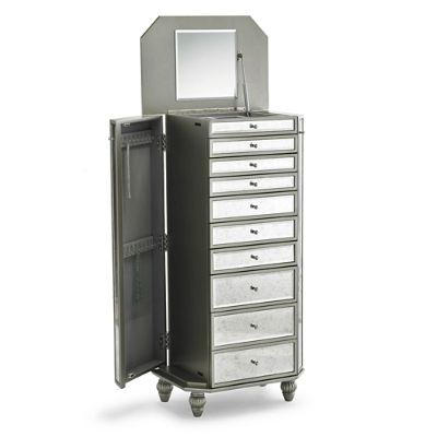 As glamorous inside as it is outside this statement piece is loaded with unique details including a set of three boutique quality neck forms for displaying favorite statement necklaces 33 interior hooks and multiple storage compartments including secret storage at the bottom. A beautiful free standing wall attached jewelry armoire the duchamps storage mirror. This storage mirror jewelry stand in an antiqued silver finish is the perfect complement to any room setting.