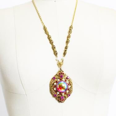Vintage 1960s Necklace Iridescent Jewel Gold Tone Pendant Long Chain Costume Jewelry 60s By Dejavintageboutique